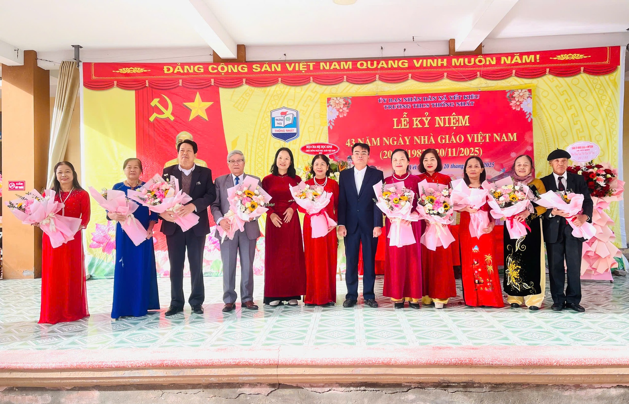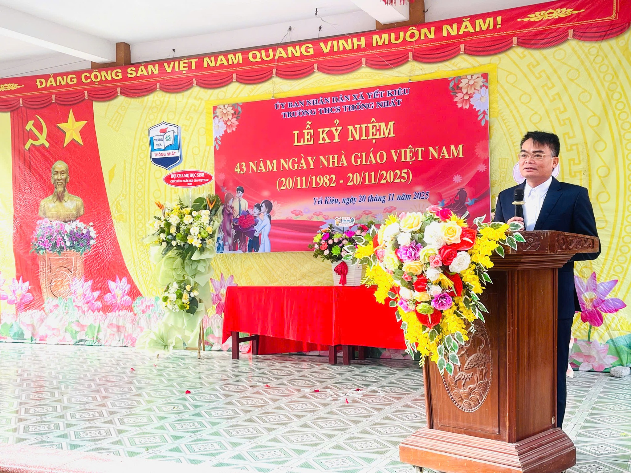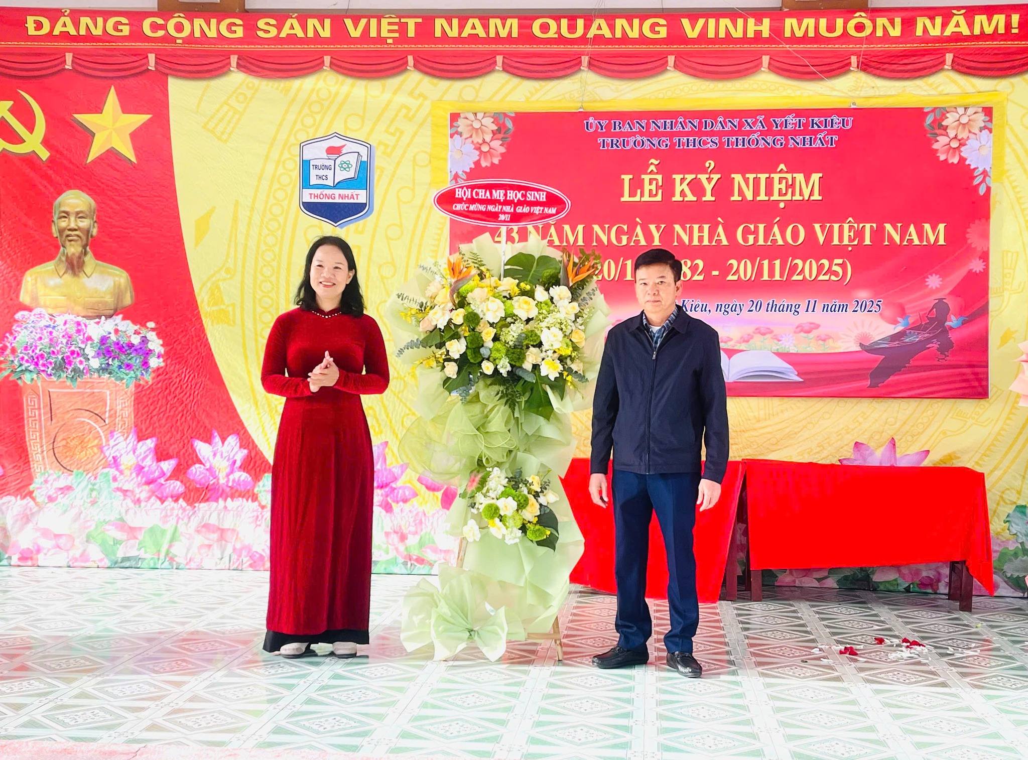 Nhân kỷ niệm 43 năm Ngày Nhà giáo Việt Nam (20/11/1982 - 20/11/2025), sáng 20/11, đồng chí Vũ Văn Cấp - Bí thư Đảng ủy, Chủ tịch HĐND xã Yết Kiêu đến thăm, tặng hoa và chúc mừng tập thể cán bộ, giáo viên, nhân viên Trường THCS Thống Nhất. Cùng dự có đồng chí Nguyễn Thị Hương Lý – Đảng ủy viên, Phó thường trực Ban xây dựng Đảng của xã; lãnh đạo quản lý và giáo viên nhà trường qua các thời kỳ cùng đông đảo giáo viên, học sinh nhà trường.